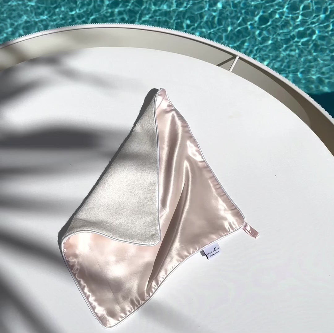 Fabric: 100% pure mulberry silk, 22 momme | 100% bamboo baby terry towel, 550 gsm.