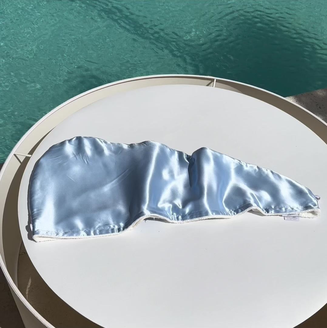 Includes: 1 x sky blue face towel (11.5” x 11.5”) | 1 x sky blue hair turban towel (26.5” x 11.5”) | Machine washable | See benefits page.